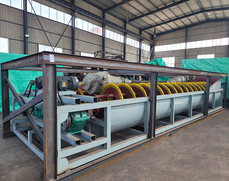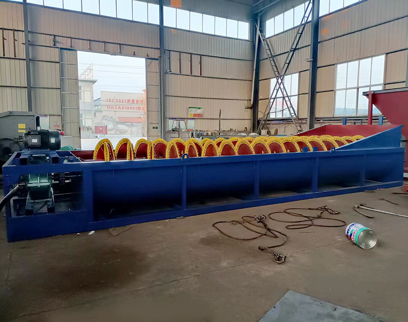 螺旋洗砂机有固定的螺旋叶片,通过螺旋叶片的不断推动将砂石表面的泥质杂质分选出来,使用给料机将物料从螺旋洗砂机上方送入洗砂槽中,随着螺旋叶片的加速旋转,砂石料被不断推向另一方向,在此过程中,重力较轻的泥质杂质、腐叶等杂物浮在表面被剥离出去,螺旋洗砂机就是借助固体颗粒的比重不同因而在液体中沉降速度不同的原理对砂石进行清洗、分选。